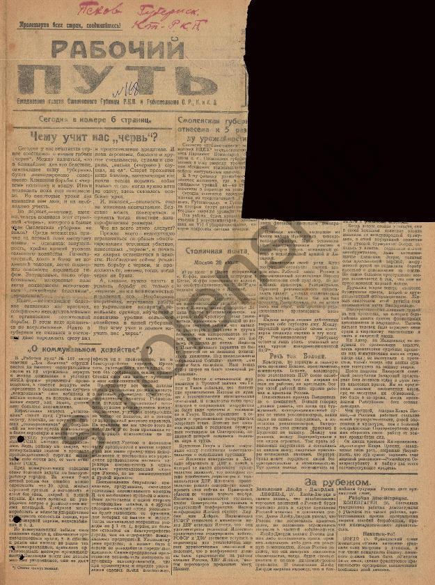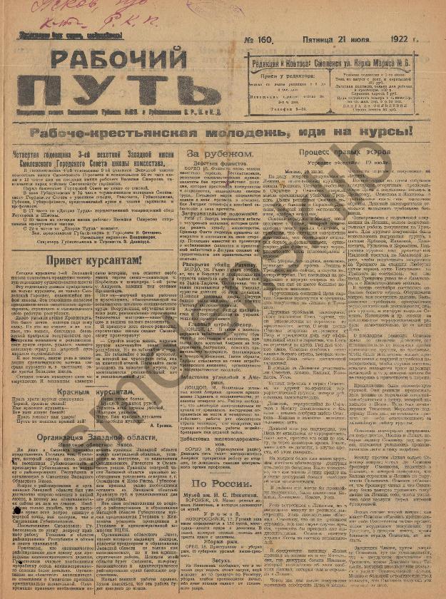 Рабочий путь / Орган Смоленского Губернского Комитета РКП(б) и Губисполкома Советов РК и КД. — Смоленск: 2-я тип. Совнархоза, 1920-____. № 160.