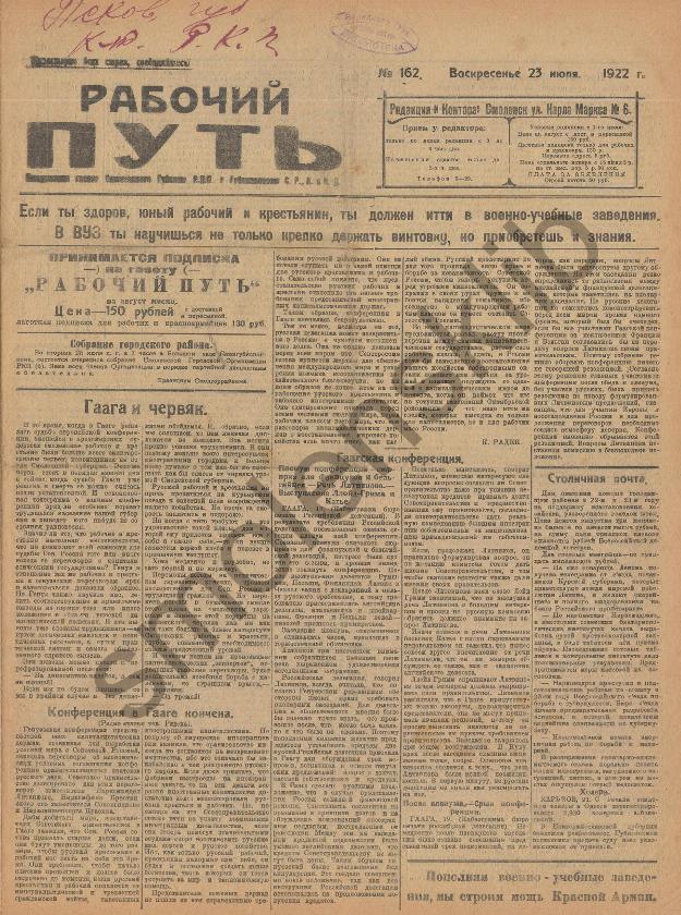 Рабочий путь / Орган Смоленского Губернского Комитета РКП(б) и Губисполкома Советов РК и КД. — Смоленск: 2-я тип. Совнархоза, 1920-____. № 162.