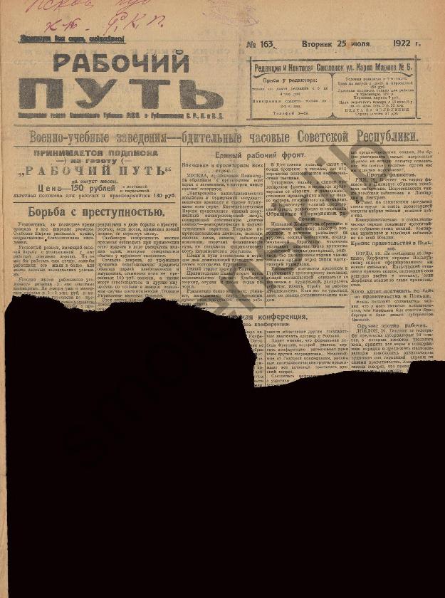 Рабочий путь / Орган Смоленского Губернского Комитета РКП(б) и Губисполкома Советов РК и КД. — Смоленск: 2-я тип. Совнархоза, 1920-____. № 163.