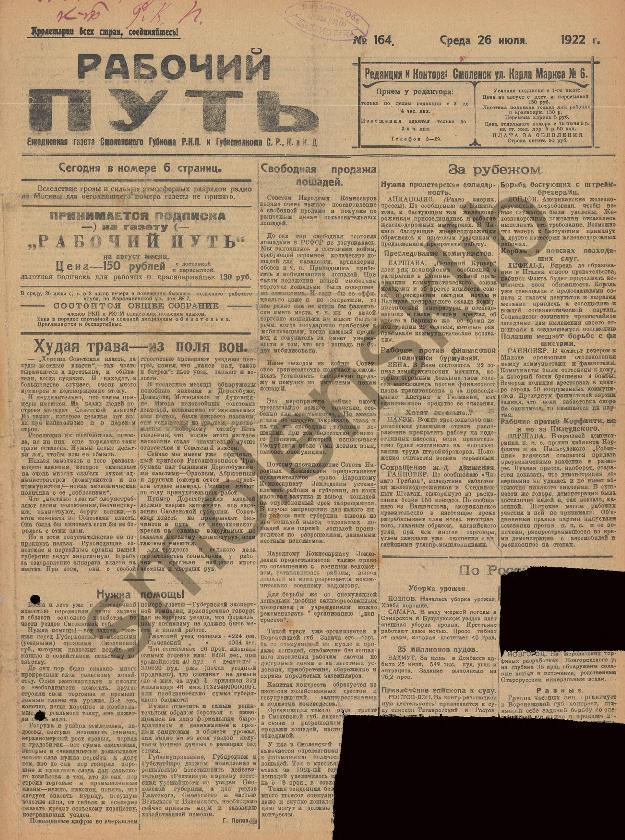 Рабочий путь / Орган Смоленского Губернского Комитета РКП(б) и Губисполкома Советов РК и КД. — Смоленск: 2-я тип. Совнархоза, 1920-____. № 164.