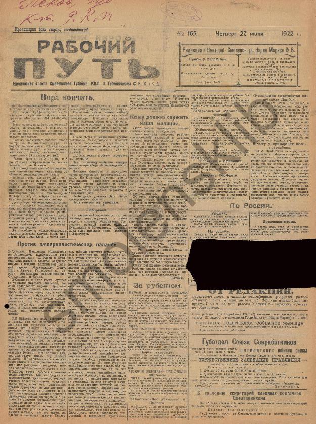 Рабочий путь / Орган Смоленского Губернского Комитета РКП(б) и Губисполкома Советов РК и КД. — Смоленск: 2-я тип. Совнархоза, 1920-____. № 165.