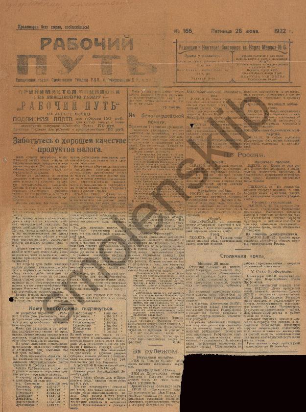 Рабочий путь / Орган Смоленского Губернского Комитета РКП(б) и Губисполкома Советов РК и КД. — Смоленск: 2-я тип. Совнархоза, 1920-____. № 166.