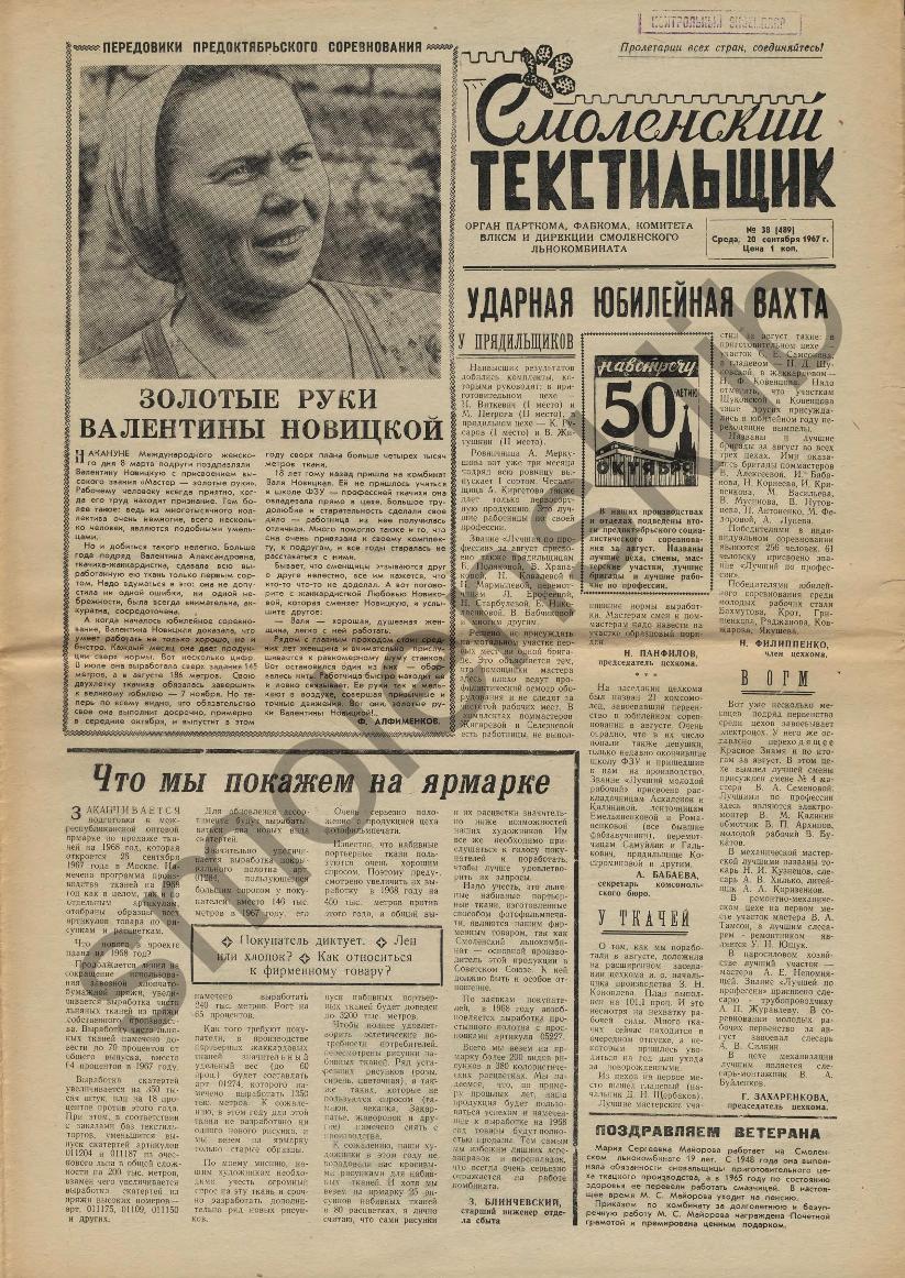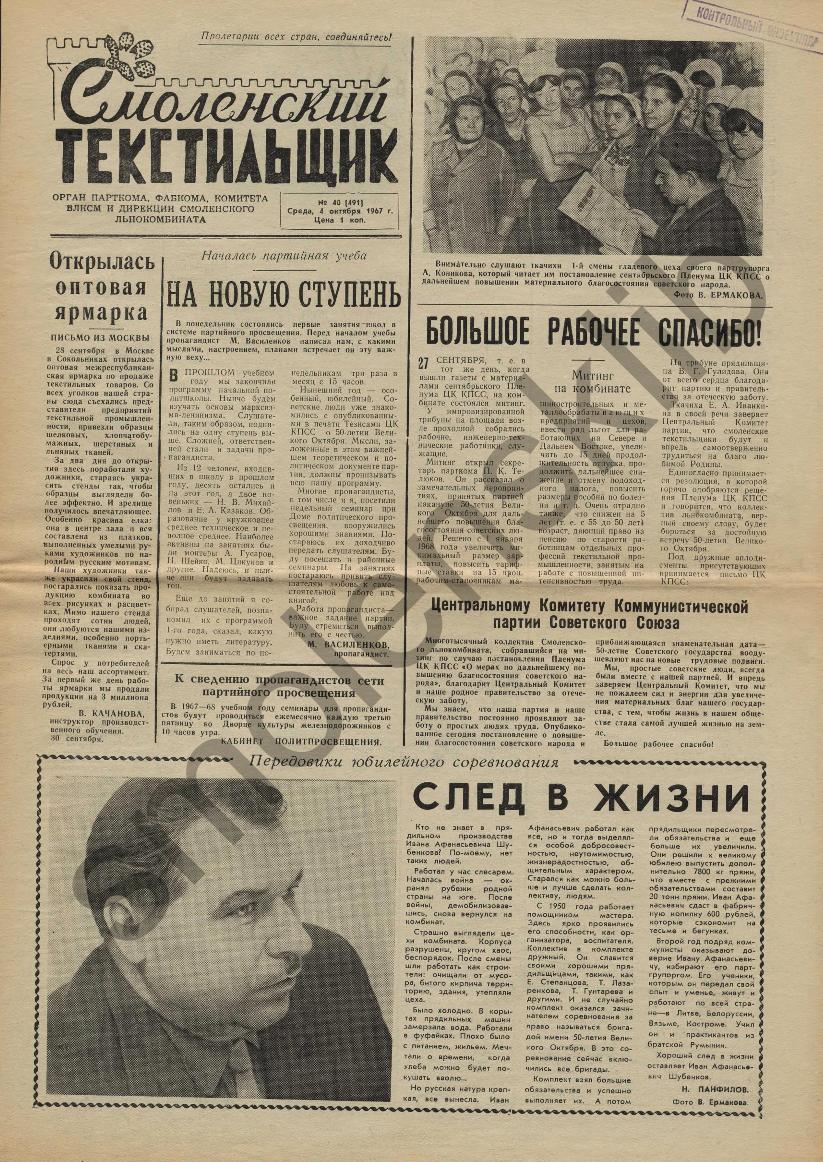 Смоленский текстильщик: Орган парткома, фабкома, комитета ВЛКСМ и дирекции Смоленского льнокомбината. — Смоленск: Тип. им. Смирнова, 1957-____. № 40.