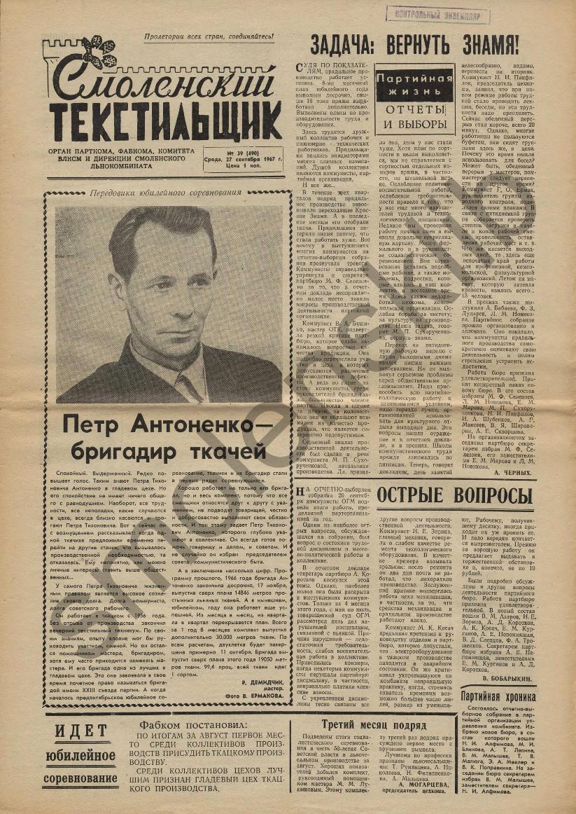 Смоленский текстильщик: Орган парткома, фабкома, комитета ВЛКСМ и дирекции Смоленского льнокомбината. — Смоленск: Тип. им. Смирнова, 1957-____. № 39.