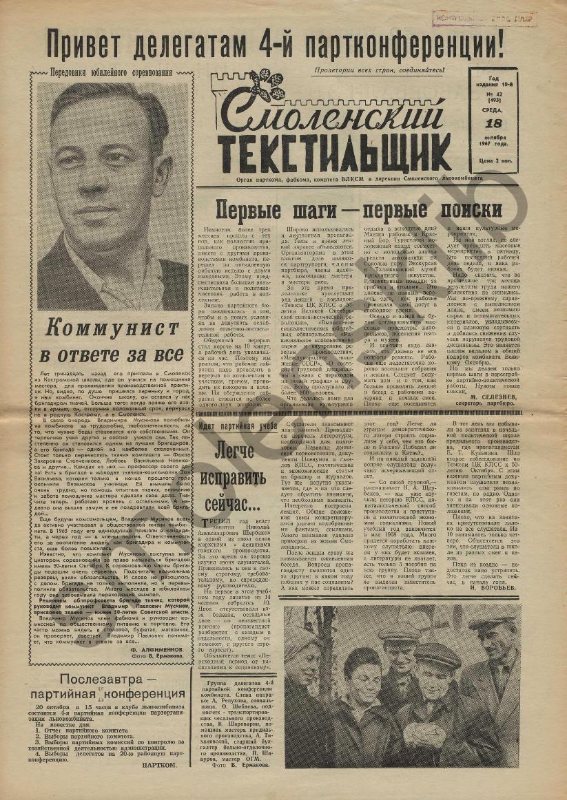 Смоленский текстильщик: Орган парткома, фабкома, комитета ВЛКСМ и дирекции Смоленского льнокомбината. — Смоленск: Тип. им. Смирнова, 1957-____. № 42.
