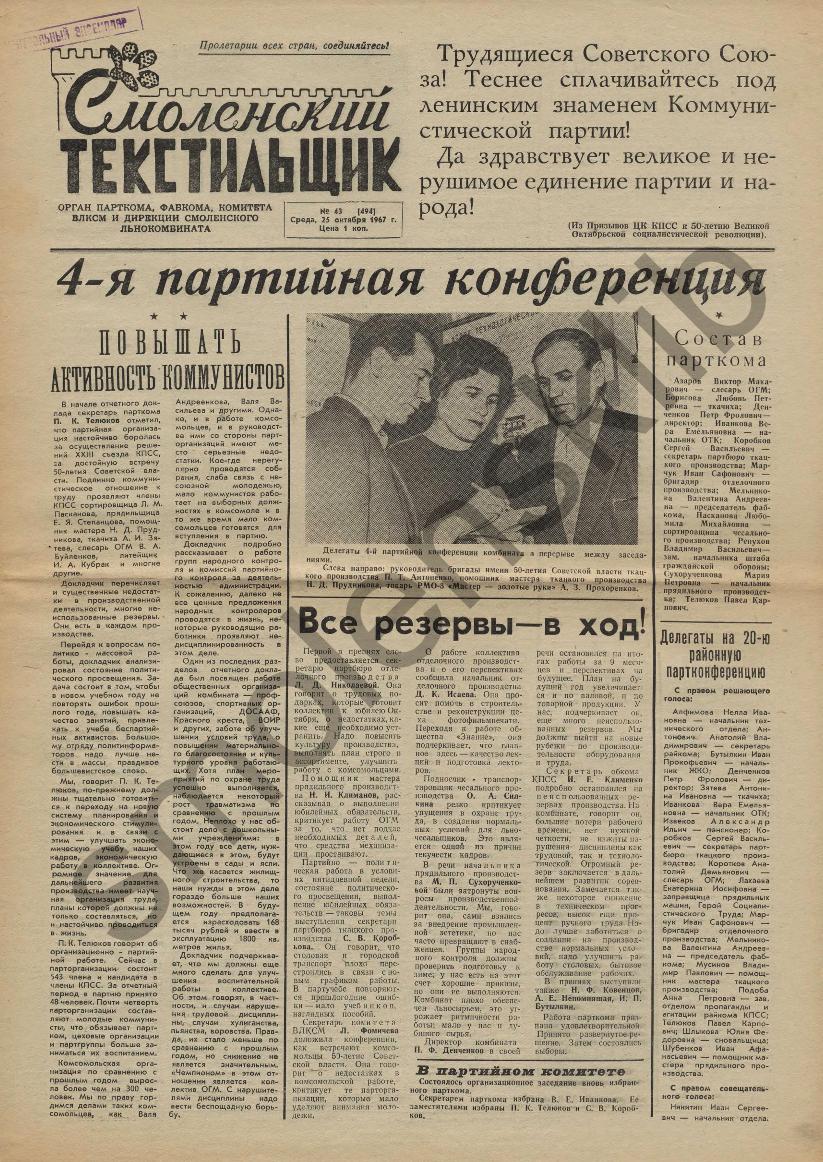 Смоленский текстильщик: Орган парткома, фабкома, комитета ВЛКСМ и дирекции Смоленского льнокомбината. — Смоленск: Тип. им. Смирнова, 1957-____. № 43.