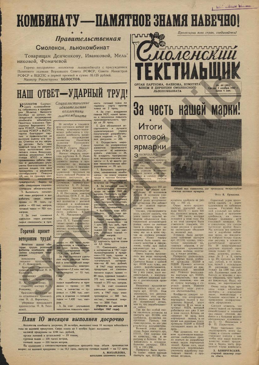 Смоленский текстильщик: Орган парткома, фабкома, комитета ВЛКСМ и дирекции Смоленского льнокомбината. — Смоленск: Тип. им. Смирнова, 1957-____. № 44.