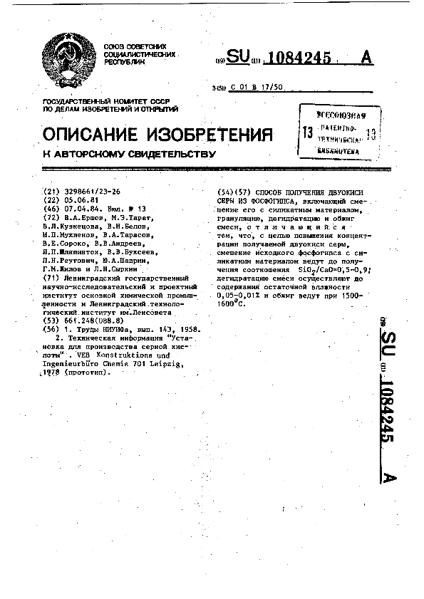 Способ получения двуокиси серы из фосфогипса / Ершов В. А., Тарат М. Э., Кузнецова В. Л. [и др.]; заявитель : Ленинградский государственный научно-исследовательский и проектный институт основной химической промышленности, Ленинградский технологический институт им. Ленсовета // Описания изобретений (ретрофонд) / Комитет по патентам и товарным знакам России. – М. — (Патенты России)., 2003. – 1984, № 1. — Загл. с титул. экрана. — Поисковая система: ИПС MIMOSA GTI. — Систем. требования: Acrobat Reader. — Режим доступа: ftp://smolensklib.ru/bd/patent_ru/pt1084245.pdf. — <URL:ftp://smolensklib.ru/bd/patent_ru/pt1084245.pdf>.