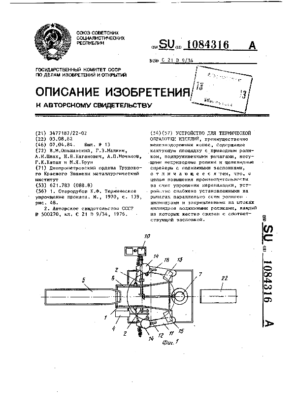 Устройство для термической обработки изделий / Ольшанский В. М., Малкин Г. З., Шпак А. И. [и др.]; заявитель : Днепропетровский ордена Трудового Красного Знамени металлургический институт // Описания изобретений (ретрофонд) / Комитет по патентам и товарным знакам России. – М. — (Патенты России)., 2003. – 1984, № 1. — Загл. с титул. экрана. — Систем. требования: Acrobat Reader. — Режим доступа: ftp://smolensklib.ru/bd/patent_ru/pt1084316.pdf. — <URL:ftp://smolensklib.ru/bd/patent_ru/pt1084316.pdf>.