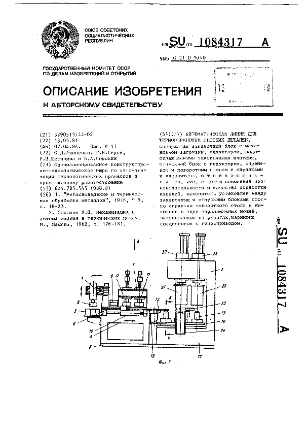 Автоматическая линия для термообработки плоских деталий / Анипенко С. Д., Перов Г. В., Щетинина Р. П., Сорокин В. А.; заявитель : Специализированное конструкторско-технологическое бюро по автоматизации технологических процессов и промышленному роботостроению // Описания изобретений (ретрофонд) / Комитет по патентам и товарным знакам России. – М. — (Патенты России)., 2003. – 1984, № 1. — Загл. с титул. экрана. — Систем. требования: Acrobat Reader. — Режим доступа: ftp://smolensklib.ru/bd/patent_ru/pt1084317.pdf. — <URL:ftp://smolensklib.ru/bd/patent_ru/pt1084317.pdf>.