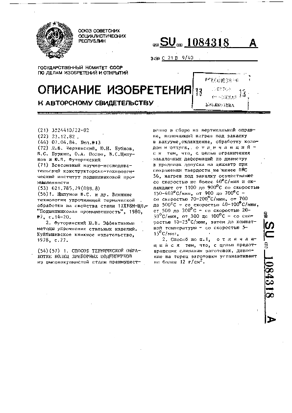 Способ термической обработки колец приборных подшипников / Черневский Л. В., Бубнов Ю. И., Буркин В. С. [и др.]; заявитель : Всесоюзный научно-исследовательский конструкторско-технологический институт подшипниковой промышленности // Описания изобретений (ретрофонд) / Комитет по патентам и товарным знакам России. – М. — (Патенты России)., 2003. – 1984, № 1. — Загл. с титул. экрана. — Систем. требования: Acrobat Reader. — Режим доступа: ftp://smolensklib.ru/bd/patent_ru/pt1084318.pdf. — <URL:ftp://smolensklib.ru/bd/patent_ru/pt1084318.pdf>.