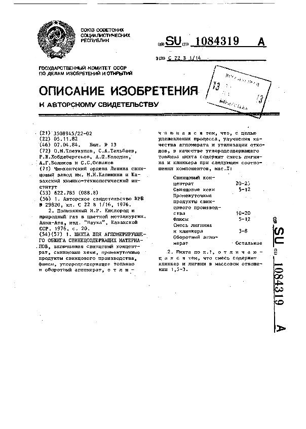 Шихта для агломирирующего обжига свенецсодержащих материалов / Тлеукулов О. М., Тельбаев С. А., Хобдабергенов Р. Ж. [и др.]; заявитель : Чимкентский ордена Ленина свинцовый завод им. М. И. Калинина, Казахский химико-технологический институт // Описания изобретений (ретрофонд) / Комитет по патентам и товарным знакам России. – М. — (Патенты России)., 2003. – 1984, № 1. — Загл. с титул. экрана. — Систем. требования: Acrobat Reader. — Режим доступа: ftp://smolensklib.ru/bd/patent_ru/pt1084319.pdf. — <URL:ftp://smolensklib.ru/bd/patent_ru/pt1084319.pdf>.
