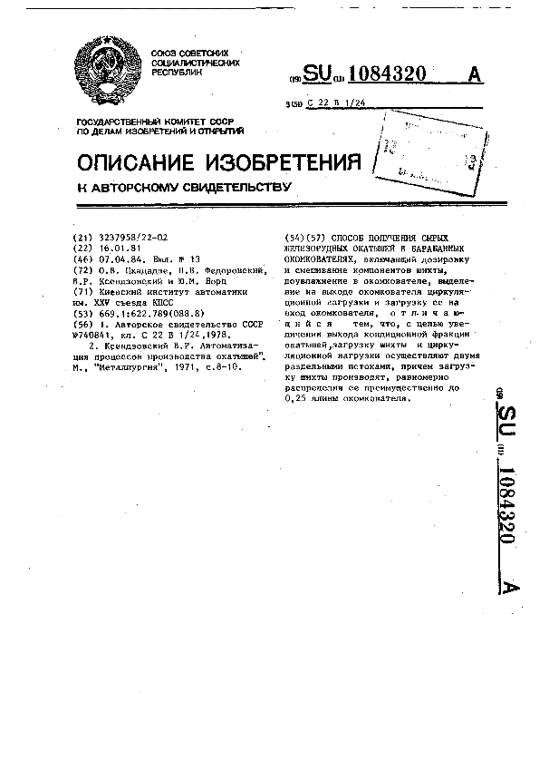 Способ получения сырых железорудных окатышей в барабанных окомкователях / Цхададзе О. В., Федоровский Н. В., Ксендзовский В. Р., Борц Ю. М.; заявитель : Киевский институт автоматики им. XXV съезда КПСС // Описания изобретений (ретрофонд) / Комитет по патентам и товарным знакам России. – М. — (Патенты России)., 2003. – 1984, № 1. — Загл. с титул. экрана. — Систем. требования: Acrobat Reader. — Режим доступа: ftp://smolensklib.ru/bd/patent_ru/pt1084320.pdf. — <URL:ftp://smolensklib.ru/bd/patent_ru/pt1084320.pdf>.