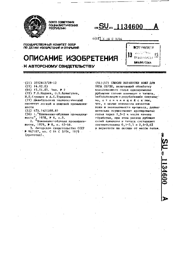 Способ выработки кожи для низа обуви / У. К. Мадиев, О. К. Кожагулов, И. П. Страхов, А. С. Турарова; заявитель: Джамбульский технологический институт легкой и пищевой промышленности // Описания изобретений (ретрофонд) / Комитет по патентам и товарным знакам России. – М., 2003. – 1985, № 1. — (Патенты России). — Загл. с титул. экрана. — Поисковая система: MIMOSA GTI. — Систем. требования: Acrobat Reader. — Режим доступа: ftp://smolensklib.ru/bd/patent_ru/pt1134600.pdf. — <URL:ftp://smolensklib.ru/bd/patent_ru/pt1134600.pdf>.