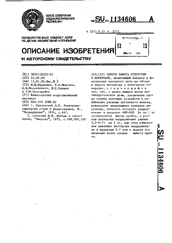 Способ выжига отверстия в материале / М. П. Марденов, Б. А. Морозов, А. В. Масленников [и др.]; заявитель: Павлодарский индустриальныйинститут // Описания изобретений (ретрофонд) / Комитет по патентам и товарным знакам России. – М., 2003. – 1985, № 1. — (Патенты России). — Загл. с титул. экрана. — Систем. требования: Acrobat Reader. — Режим доступа: ftp://smolensklib.ru/bd/patent_ru/pt1134606.pdf. — <URL:ftp://smolensklib.ru/bd/patent_ru/pt1134606.pdf>.
