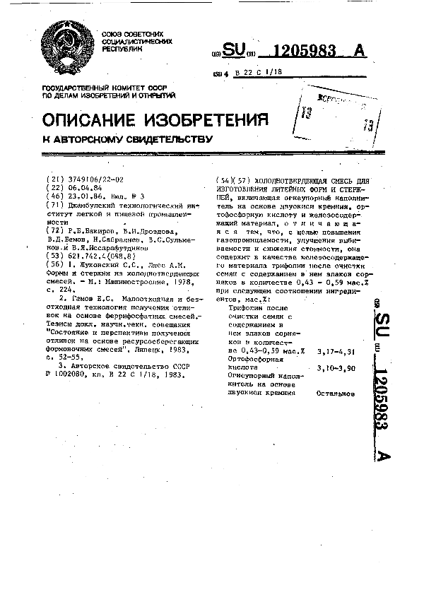 Холоднотвердеющая смесь для изготовления литейных форм и стержней / Бакиров Р. Б., Дроздова В. И., Бемов В. Д. [и др.]; заявитель: Джамбулский технологический институт легкой и пищевой промышленности // Описания изобретений (ретрофонд) / Комитет по патентам и товарным знакам России. – М., 2003. – 1986, № 1. — (Патенты России). — Загл. с титул. экрана. — Поисковая система: ИПС MIMOSA GTI. — Систем. требования: Acrobat Reader. — Режим доступа: ftp://smolensklib.ru/bd/patent_ru/pt1205983.pdf. — <URL:ftp://smolensklib.ru/bd/patent_ru/pt1205983.pdf>.