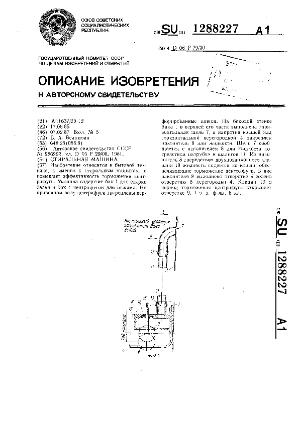 Стиральная машина / Беломоин В. А. // Описания изобретений (ретрофонд) / Комитет по патентам и товарным знакам России. – М., 2003. – 1987, № 1. — (Патенты России). — Загл. с титул. экрана. — Поисковая система: MIMOSA GTI. — Систем. требования: Acrobat Reader. — Режим доступа: ftp://smolensklib.ru/bd/patent_ru/pt1288227.pdf. — <URL:ftp://smolensklib.ru/bd/patent_ru/pt1288227.pdf>.