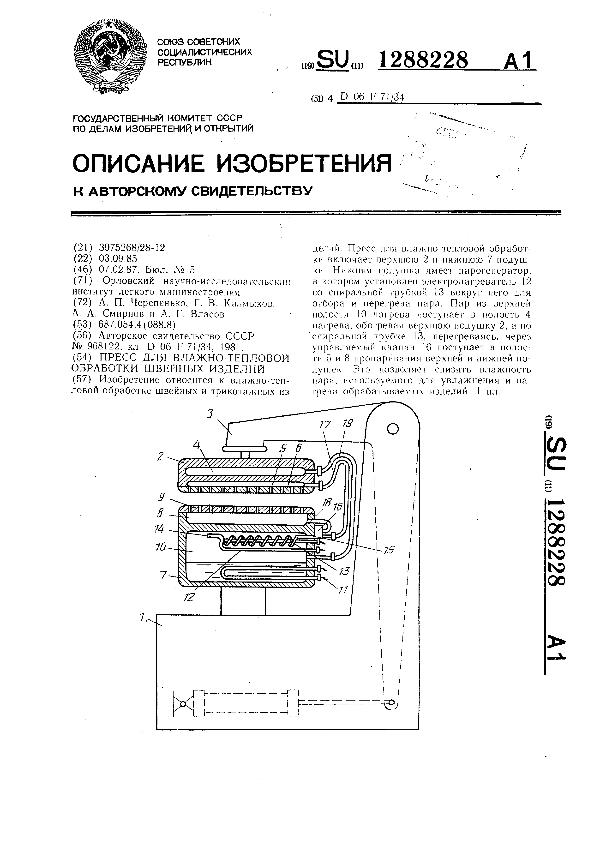 Пресс для влажно-тепловой обработки швейных изделий / Черепенько А. П., Калмыков Г. В., Смирнов А. А., Власов А. Г.; заявитель: Орловский научно-исследовательский институт легкого машиностроения // Описания изобретений (ретрофонд) / Комитет по патентам и товарным знакам России. – М., 2003. – 1987, № 1. — (Патенты России). — Загл. с титул. экрана. — Поисковая система: MIMOSA GTI. — Систем. требования: Acrobat Reader. — Режим доступа: ftp://smolensklib.ru/bd/patent_ru/pt1288228.pdf. — <URL:ftp://smolensklib.ru/bd/patent_ru/pt1288228.pdf>.
