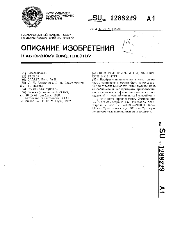 Композиция для отделки вискозных нитей / Агафонова Л. Л., Главочевская Р. А., Панова Л. Н. // Описания изобретений (ретрофонд) / Комитет по патентам и товарным знакам России. – М., 2003. – 1987, № 1. — (Патенты России). — Загл. с титул. экрана. — Поисковая система: MIMOSA GTI. — Систем. требования: Acrobat Reader. — Режим доступа: ftp://smolensklib.ru/bd/patent_ru/pt1288229.pdf. — <URL:ftp://smolensklib.ru/bd/patent_ru/pt1288229.pdf>.
