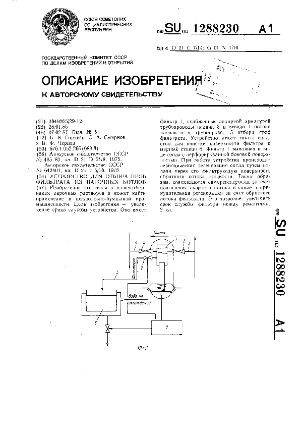 Устройство для отбора проб фильтрата из варочных котлов / Гордеев Б. В., Смирнов С. А., Чернов В. Ф. // Описания изобретений (ретрофонд) / Комитет по патентам и товарным знакам России. – М., 2003. – 1987, № 1. — (Патенты России). — Загл. с титул. экрана. — Поисковая система: MIMOSA GTI. — Систем. требования: Acrobat Reader. — Режим доступа: ftp://smolensklib.ru/bd/patent_ru/pt1288230.pdf. — <URL:ftp://smolensklib.ru/bd/patent_ru/pt1288230.pdf>.