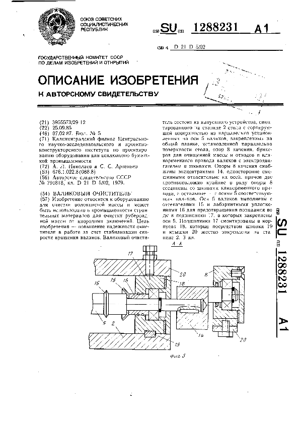 Валиковый очиститель / Николаев А. Л., Артемьев С. С.; заявитель: Калининградский филиал Центрального научно-исследовательского и проектно-конструкторского института по проектированию оборудования для целлюлозно-бумажной промышленности // Описания изобретений (ретрофонд) / Комитет по патентам и товарным знакам России. – М., 2003. – 1987, № 1. — (Патенты России). — Загл. с титул. экрана. — Поисковая система: MIMOSA GTI. — Систем. требования: Acrobat Reader. — Режим доступа: ftp://smolensklib.ru/bd/patent_ru/pt1288231.pdf. — <URL:ftp://smolensklib.ru/bd/patent_ru/pt1288231.pdf>.