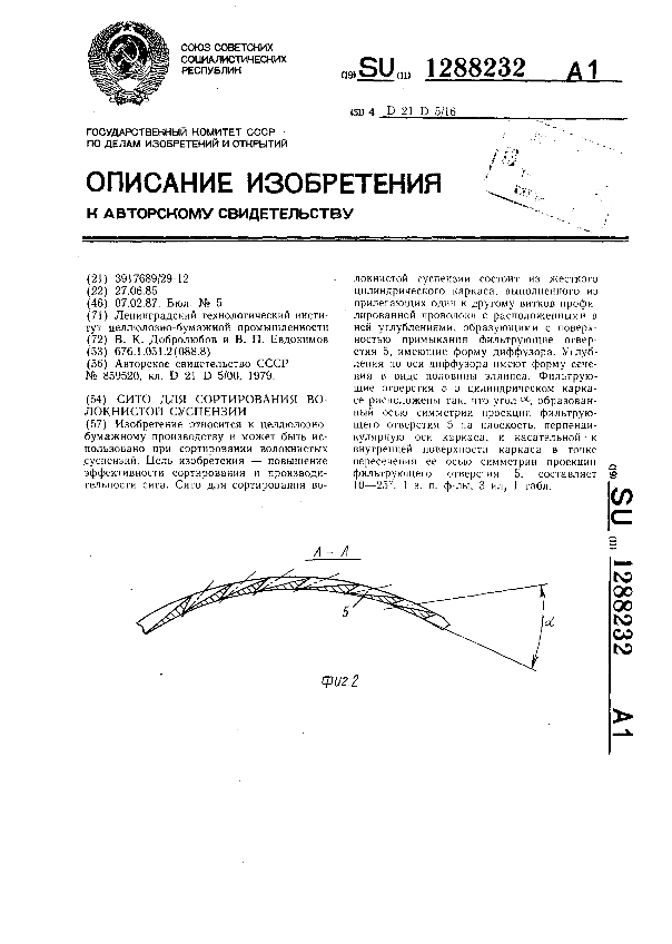 Сито для сортирования волокнистой суспензии / Добролюбов В. К., Евдокимов В. П.; заявитель: Ленинградский технологический институт целлюлозно-бумажной промышленности // Описания изобретений (ретрофонд) / Комитет по патентам и товарным знакам России. – М., 2003. – 1987, № 1. — (Патенты России). — Загл. с титул. экрана. — Поисковая система: MIMOSA GTI. — Систем. требования: Acrobat Reader. — Режим доступа: ftp://smolensklib.ru/bd/patent_ru/pt1288232.pdf. — <URL:ftp://smolensklib.ru/bd/patent_ru/pt1288232.pdf>.