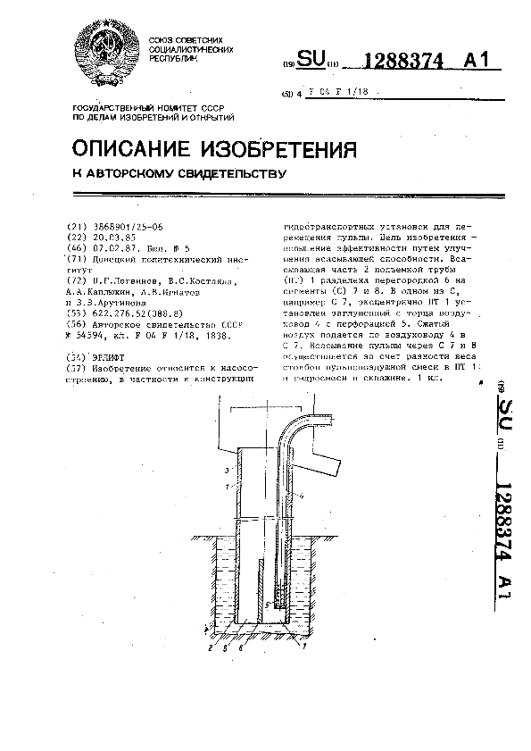 Эрлифт / Логвинов Н. Г., Костанда В. С., Каплюхин А. А. [и др.]; заявитель: Донецкий политехнический институт // Описания изобретений (ретрофонд) / Комитет по патентам и товарным знакам России. – М., 2003. – 1987, № 1. — (Патенты России). — Загл. с титул. экрана. — Поисковая система: MIMOSA GTI. — Систем. требования: Acrobat Reader. — Режим доступа: ftp://smolensklib.ru/bd/patent_ru/pt1288374.pdf. — <URL:ftp://smolensklib.ru/bd/patent_ru/pt1288374.pdf>.