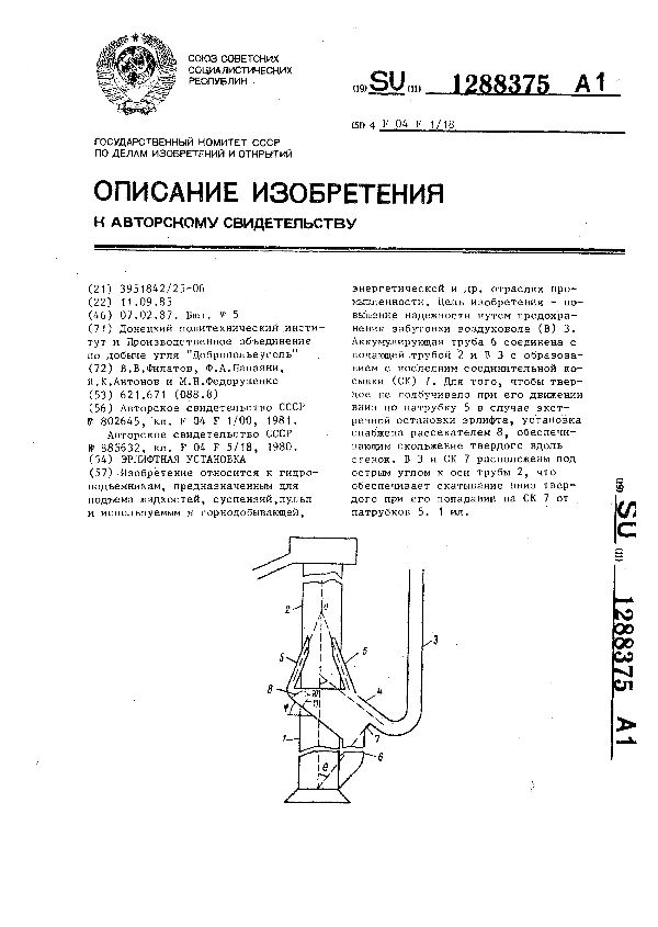 Эрлифтная установка / Филатов В. В., Папаяни Ф. А., Антонов Я. К., Федорущенко М. Н.; заявитель: Донецкий политехнический институт, Производственное объединение по добыче угля "Добропольеуголь" // Описания изобретений (ретрофонд) / Комитет по патентам и товарным знакам России. – М., 2003. – 1987, № 1. — (Патенты России). — Загл. с титул. экрана. — Поисковая система: MIMOSA GTI. — Систем. требования: Acrobat Reader. — Режим доступа: ftp://smolensklib.ru/bd/patent_ru/pt1288375.pdf. — <URL:ftp://smolensklib.ru/bd/patent_ru/pt1288375.pdf>.