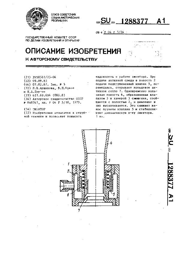 Эжектор / Архипова Л. В., Буков В. П., Пуртов Н. А. // Описания изобретений (ретрофонд) / Комитет по патентам и товарным знакам России. – М., 2003. – 1987, № 1. — (Патенты России). — Загл. с титул. экрана. — Поисковая система: MIMOSA GTI. — Систем. требования: Acrobat Reader. — Режим доступа: ftp://smolensklib.ru/bd/patent_ru/pt1288377.pdf. — <URL:ftp://smolensklib.ru/bd/patent_ru/pt1288377.pdf>.