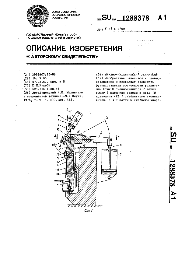 Пневмо-механический усилитель / Кукоба Ю. П. // Описания изобретений (ретрофонд) / Комитет по патентам и товарным знакам России. – М., 2003. – 1987, № 1. — (Патенты России). — Загл. с титул. экрана. — Поисковая система: MIMOSA GTI. — Систем. требования: Acrobat Reader. — Режим доступа: ftp://smolensklib.ru/bd/patent_ru/pt1288378.pdf. — <URL:ftp://smolensklib.ru/bd/patent_ru/pt1288378.pdf>.