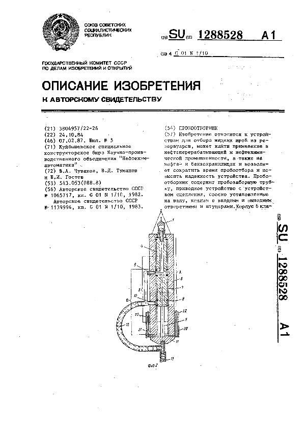 Пробоотборник / Чуваков В. А., Тумашов В. Д., Гостев Б. И.; заявитель: Куйбышевское специальное конструкторское бюро Научно-производственного объединения "Нефтехимавтоматика" // Описания изобретений (ретрофонд) / Комитет по патентам и товарным знакам России. – М., 2003. – 1987, № 1. — (Патенты России). — Загл. с титул. экрана. — Поисковая система: MIMOSA GTI. — Систем. требования: Acrobat Reader. — Режим доступа: ftp://smolensklib.ru/bd/patent_ru/pt1288528.pdf. — <URL:ftp://smolensklib.ru/bd/patent_ru/pt1288528.pdf>.