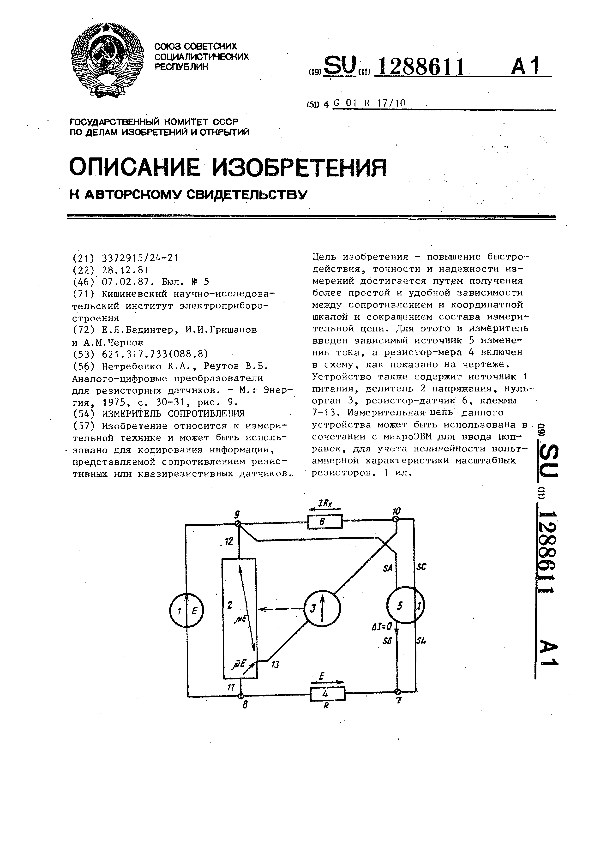 Измеритель сопротивления / Бадинтер Е. Я., Гришанов И. И., Чернов А. М.; заявитель: Кишиневский научно-исследовательский институт электроприборостроения // Описания изобретений (ретрофонд) / Комитет по патентам и товарным знакам России. – М., 2003. – 1987, № 1. — (Патенты России). — Загл. с титул. экрана. — Поисковая система: MIMOSA GTI. — Систем. требования: Acrobat Reader. — Режим доступа: ftp://smolensklib.ru/bd/patent_ru/pt1288611.pdf. — <URL:ftp://smolensklib.ru/bd/patent_ru/pt1288611.pdf>.
