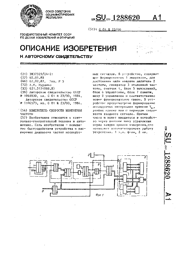 Измеритель скорости изменения частоты / Мурашко А. М. // Описания изобретений (ретрофонд) / Комитет по патентам и товарным знакам России. – М., 2003. – 1987, № 1. — (Патенты России). — Загл. с титул. экрана. — Поисковая система: MIMOSA GTI. — Систем. требования: Acrobat Reader. — Режим доступа: ftp://smolensklib.ru/bd/patent_ru/pt1288620.pdf. — <URL:ftp://smolensklib.ru/bd/patent_ru/pt1288620.pdf>.
