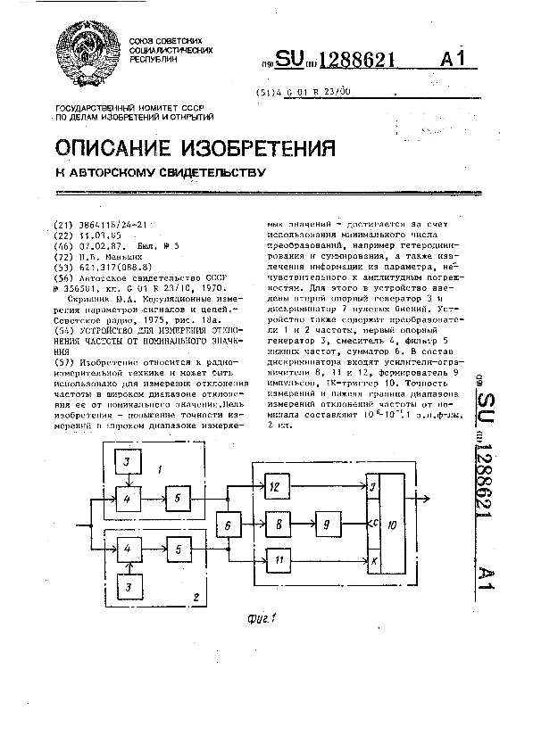 Устройство для измерения отклонения частоты от номинального значения / Меньших Н. В. // Описания изобретений (ретрофонд) / Комитет по патентам и товарным знакам России. – М., 2003. – 1987, № 1. — (Патенты России). — Загл. с титул. экрана. — Поисковая система: MIMOSA GTI. — Систем. требования: Acrobat Reader. — Режим доступа: ftp://smolensklib.ru/bd/patent_ru/pt1288621.pdf. — <URL:ftp://smolensklib.ru/bd/patent_ru/pt1288621.pdf>.