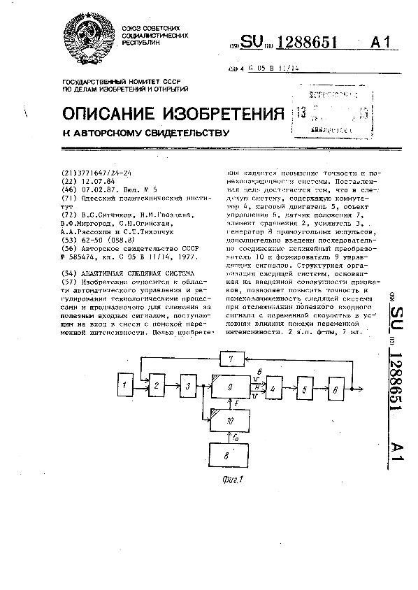 Адаптивная следящая система / Ситников В. С., Гвоздева И. М., Миргород В. Ф. [и др.]; заявитель: Одесский политехнический институт // Описания изобретений (ретрофонд) / Комитет по патентам и товарным знакам России. – М., 2003. – 1987, № 1. — (Патенты России). — Загл. с титул. экрана. — Систем. требования: Acrobat Reader. — Режим доступа: ftp://smolensklib.ru/bd/patent_ru/pt1288651.pdf. — <URL:ftp://smolensklib.ru/bd/patent_ru/pt1288651.pdf>.