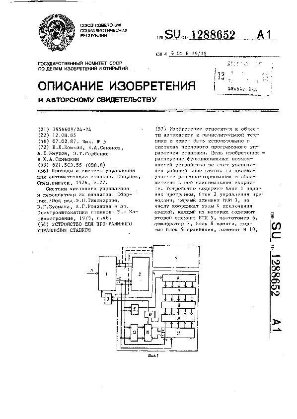 Устройство для программного управления станком / Кошкин В. Л, Семенов В. А., Жмуров А. Е. [и др.] // Описания изобретений (ретрофонд) / Комитет по патентам и товарным знакам России. – М., 2003. – 1987, № 1. — (Патенты России). — Загл. с титул. экрана. — Систем. требования: Acrobat Reader. — Режим доступа: ftp://smolensklib.ru/bd/patent_ru/pt1288652.pdf. — <URL:ftp://smolensklib.ru/bd/patent_ru/pt1288652.pdf>.