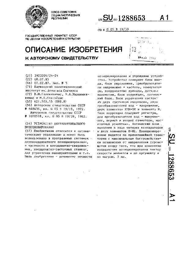 Устройство двухкоординатного позиционирования / Галяжявичюс В. Ю., Марцинкявичюс В. А., Сталнёнис М. К.; заявитель: Каунасский политехнический институт им. Антанаса Снечкуса // Описания изобретений (ретрофонд) / Комитет по патентам и товарным знакам России. – М., 2003. – 1987, № 1. — (Патенты России). — Загл. с титул. экрана. — Систем. требования: Acrobat Reader. — Режим доступа: ftp://smolensklib.ru/bd/patent_ru/pt1288653.pdf. — <URL:ftp://smolensklib.ru/bd/patent_ru/pt1288653.pdf>.