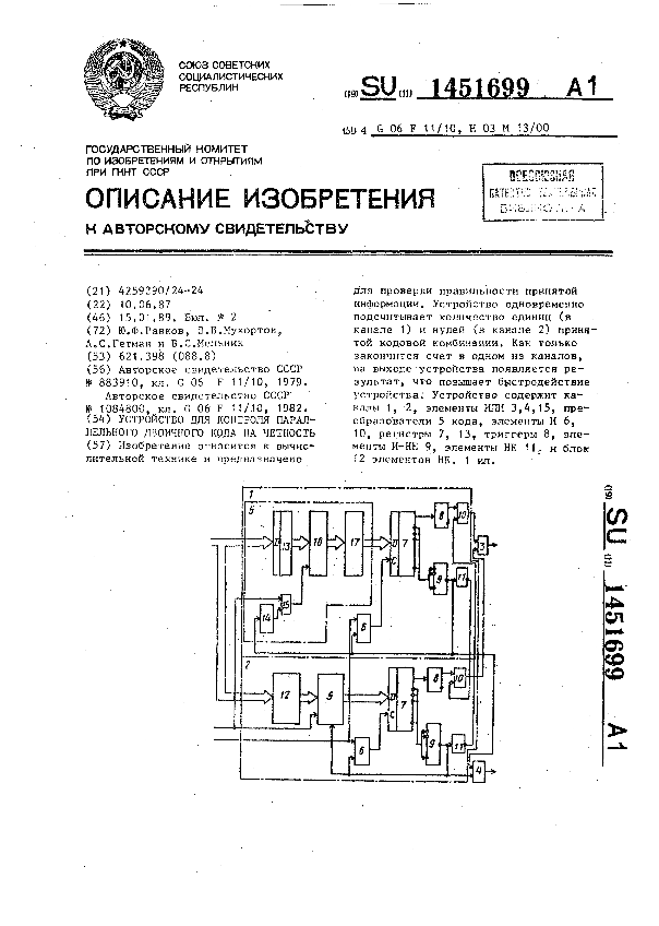 Устройство для контроля параллельного двоичного кода на четность / Равков Ю. Ф., Мухортов В. В., Гетман А. С., Мельник В. С. // Описания изобретений (ретрофонд) / Комитет по патентам и товарным знакам России. – М., 2003. – 1989, № 1. — (Патенты России). — Загл. с титул. экрана. — Систем. требования: Acrobat Reader. — Режим доступа: ftp://smolensklib.ru/bd/patent_ru/pt1451699.pdf. — <URL:ftp://smolensklib.ru/bd/patent_ru/pt1451699.pdf>.