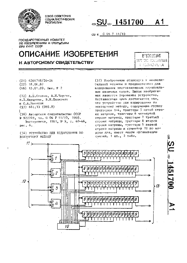 Устройство для кодирования по векторному методу / Стахов А. П., Черняк А. И., Марценюк В. П. [и др.] // Описания изобретений (ретрофонд) / Комитет по патентам и товарным знакам России. – М., 2003. – 1989, № 1. — (Патенты России). — Загл. с титул. экрана. — Систем. требования: Acrobat Reader. — Режим доступа: ftp://smolensklib.ru/bd/patent_ru/pt1451700.pdf. — <URL:ftp://smolensklib.ru/bd/patent_ru/pt1451700.pdf>.