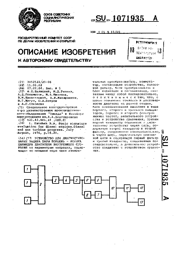 Устройство диагностирования задира пары поршень-втулка цилиндра двигателя внутреннего сгорания / Балицкий Ф. Я., Генкин М. Д., Гольмшток А. Д. [и др.]; заявители: Специальное конструкторское бюро дизелестроения производственного объединения "Звезда " ; Институт машиноведения им .А . А . Благонравова // Описания изобретений (ретрофонд) / Комитет по патентам и товарным знакам России. – М. — (Патенты России)., 2003. – 1984, № 1. — Загл. с титул. экрана. — Поисковая система: ИПС MIMOSA GTI. — Систем. требования: Acrobat Reader. — Режим доступа: ftp://smolensklib.ru/bd/patent_ru/pt1071935.pdf. — <URL:ftp://smolensklib.ru/bd/patent_ru/pt1071935.pdf>.