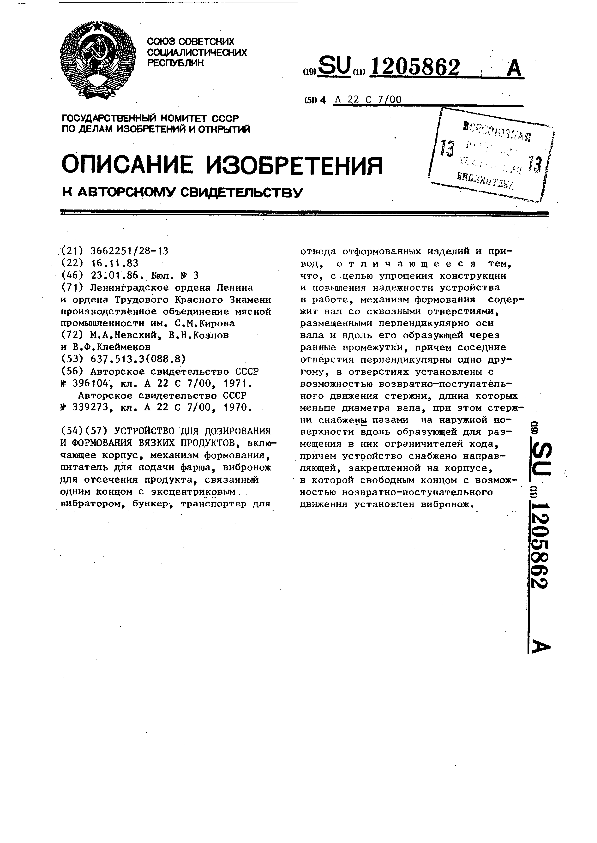 Устройство для дозирования и формования вязких продуктов / Невский М. А., Козлов В. Н., Клейменов В. Ф.; заявитель: Ленинградское ордена Ленинаи ордена Трудового Красного Знамени производствённое объединение мясной промышленности им. С. М. Кирова // Описания изобретений (ретрофонд) / Комитет по патентам и товарным знакам России. – М., 2003. – 1986, № 1. — (Патенты России). — Загл. с титул. экрана. — Поисковая система: ИПС MIMOSA GTI. — Систем. требования: Acrobat Reader. — Режим доступа: ftp://smolensklib.ru/bd/patent_ru/pt1205862.pdf. — <URL:ftp://smolensklib.ru/bd/patent_ru/pt1205862.pdf>.