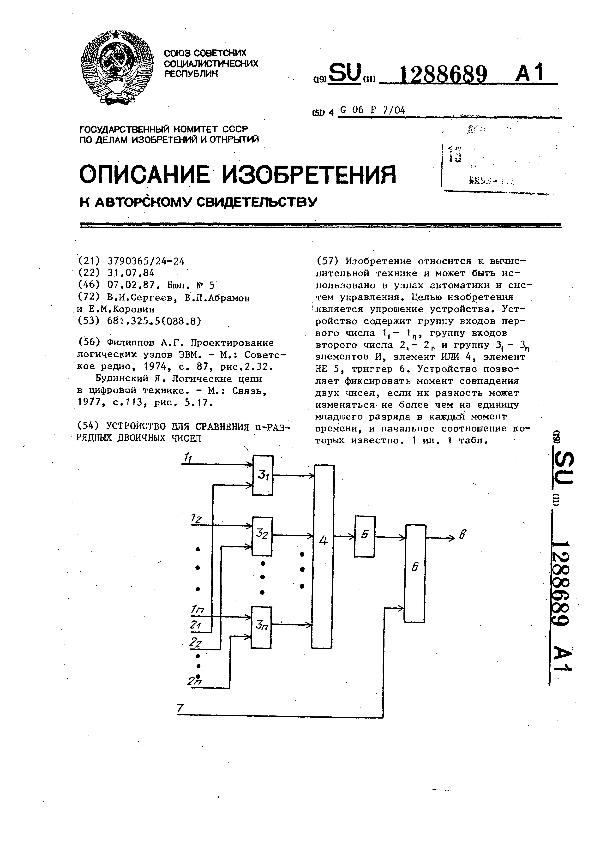 Устройство для сравнения п-разрядных двоичных чисел / Сергеев В. И., Абрамов В. П., Коровин Е. М. // Описания изобретений (ретрофонд) / Комитет по патентам и товарным знакам России. – М., 2003. – 1987, № 1. — (Патенты России). — Загл. с титул. экрана. — Систем. требования: Acrobat Reader. — Режим доступа: ftp://smolensklib.ru/bd/patent_ru/pt1288689.pdf. — <URL:ftp://smolensklib.ru/bd/patent_ru/pt1288689.pdf>.