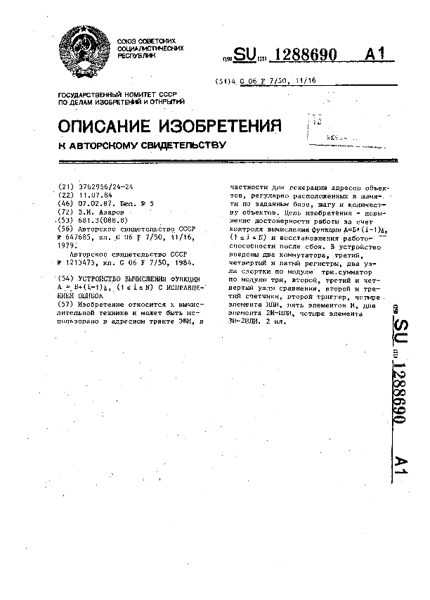 Устройство вычисления функции А = Б+(i-1)Δ , (1≤ i ≤ N) с исправлением ошибок / Азаров В. И. // Описания изобретений (ретрофонд) / Комитет по патентам и товарным знакам России. – М., 2003. – 1987, № 1. — (Патенты России). — Загл. с титул. экрана. — Систем. требования: Acrobat Reader. — Режим доступа: ftp://smolensklib.ru/bd/patent_ru/pt1288690.pdf. — <URL:ftp://smolensklib.ru/bd/patent_ru/pt1288690.pdf>.