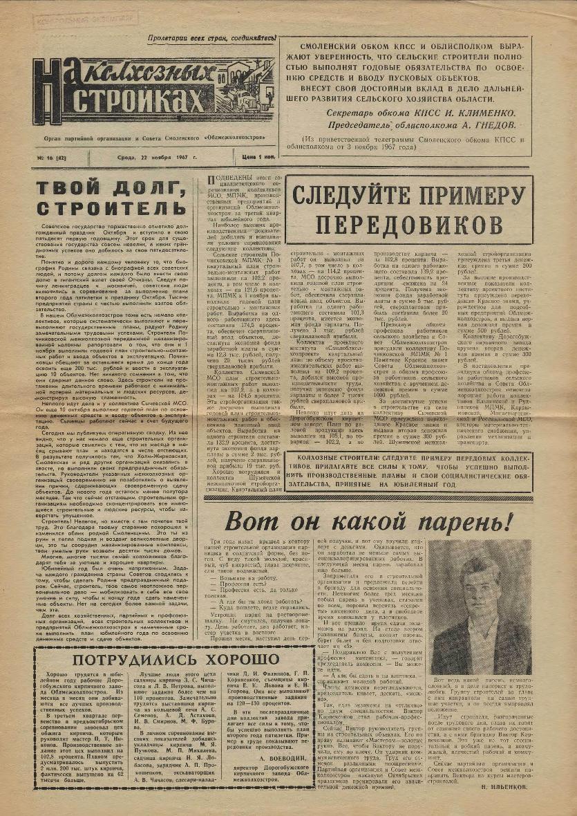На колхозных стройках: Орган партийной организации и Совета Смоленского "Облмежколхозстроя". — Смоленск: Тип. им. Смирнова, 1965-____. № 16.