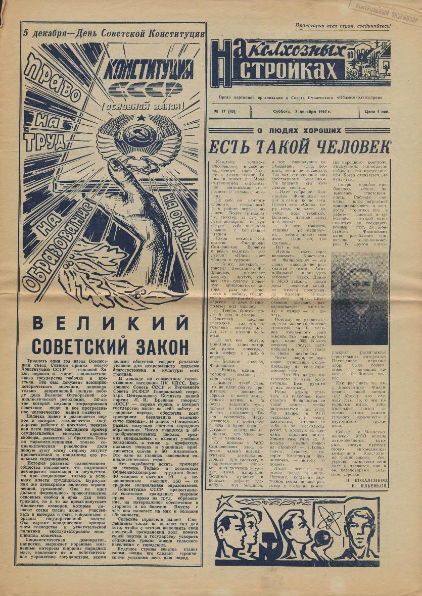На колхозных стройках: Орган партийной организации и Совета Смоленского "Облмежколхозстроя". — Смоленск: Тип. им. Смирнова, 1965-____. № 17.