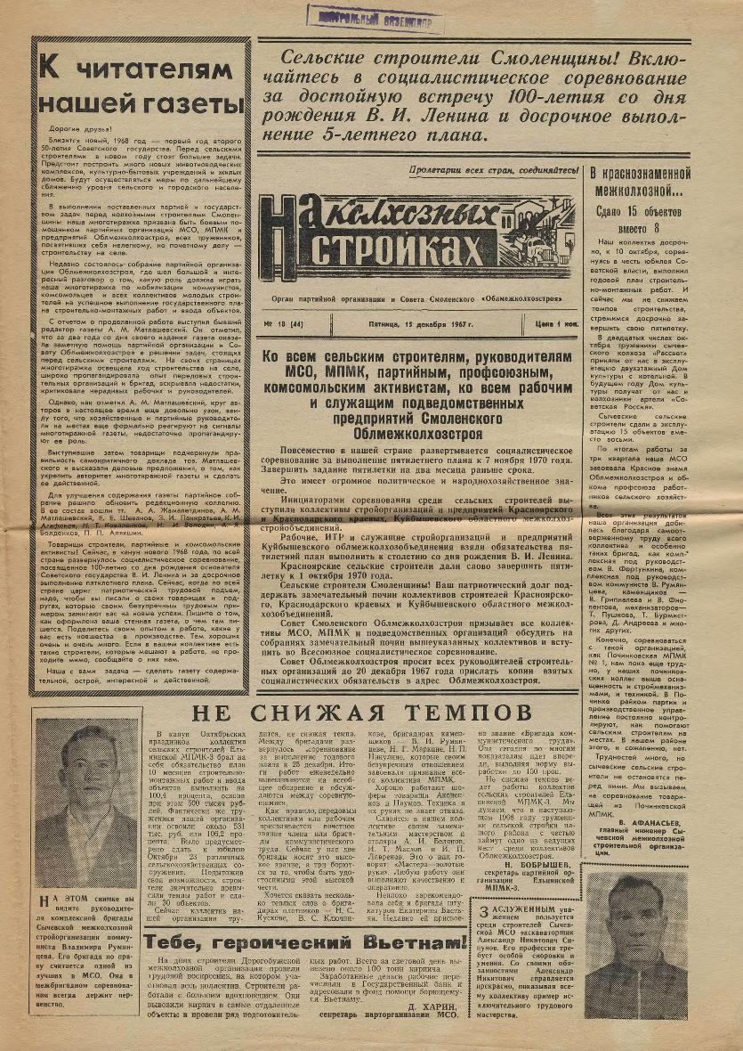 На колхозных стройках: Орган партийной организации и Совета Смоленского "Облмежколхозстроя". — Смоленск: Тип. им. Смирнова, 1965-____. № 12.