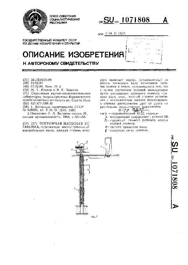 Погружная насосная установка / Козлов М. Т., Зеленов В. Е.; заявитель: Отраслевая научно-исследовательская лаборатория ветроэнергетики Кишиневского политехнического института им. Сергея Лазо // Описания изобретений (ретрофонд) / Комитет по патентам и товарным знакам России. – М. — (Патенты России)., 2003. – 1984, № 1. — Загл. с титул. экрана. — Поисковая система: ИПС MIMOSA GTI. — Систем. требования: Acrobat Reader. — Режим доступа: ftp://smolensklib.ru/bd/patent_ru/pt1071808.pdf. — <URL:ftp://smolensklib.ru/bd/patent_ru/pt1071808.pdf>.