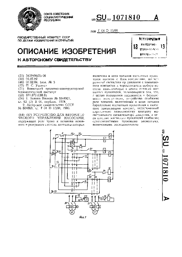 Устройство для автоматического управления насосами / Ушаков П. С.; заявитель: Винницкий проектно-конструкторский технологический институт // Описания изобретений (ретрофонд) / Комитет по патентам и товарным знакам России. – М. — (Патенты России)., 2003. – 1984, № 1. — Загл. с титул. экрана. — Поисковая система: ИПС MIMOSA GTI. — Систем. требования: Acrobat Reader. — Режим доступа: ftp://smolensklib.ru/bd/patent_ru/pt1071810.pdf. — <URL:ftp://smolensklib.ru/bd/patent_ru/pt1071810.pdf>.