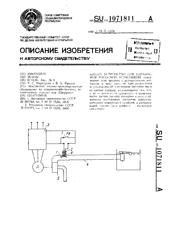Устройство для управления насосной установкой / Меркурьев В. С., Фролов В. А.; заявитель:Всесоюзное научно-производственное объединение по сельскохозяйственному использованию сточных вод «Прогресс» // Описания изобретений (ретрофонд) / Комитет по патентам и товарным знакам России. – М. — (Патенты России)., 2003. – 1984, № 1. — Загл. с титул. экрана. — Поисковая система: ИПС MIMOSA GTI. — Систем. требования: Acrobat Reader. — Режим доступа: ftp://smolensklib.ru/bd/patent_ru/pt1071811.pdf. — <URL:ftp://smolensklib.ru/bd/patent_ru/pt1071811.pdf>.