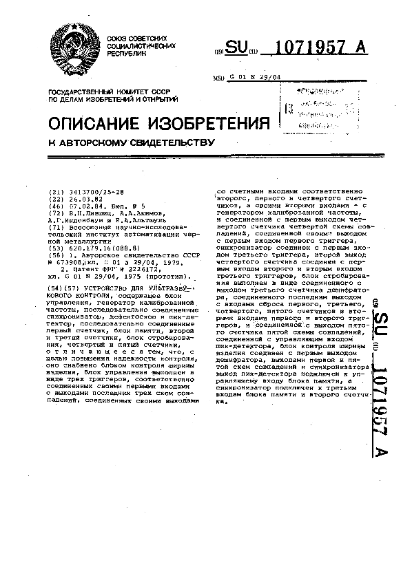 Устройство для ультразвукового контроля / Лившиц Б. Н., Акимов А. А.,Инденбаум А. Г., Альтшуль Е. А.; заявитель: Всесоюзный научно-исследовательский институт автоматизации чёрной металлургии // Описания изобретений (ретрофонд) / Комитет по патентам и товарным знакам России. – М. — (Патенты России)., 2003. – 1984, № 1. — Загл. с титул. экрана. — Систем. требования: Acrobat Reader. — Режим доступа: ftp://smolensklib.ru/bd/patent_ru/pt1071957.pdf. — <URL:ftp://smolensklib.ru/bd/patent_ru/pt1071957.pdf>.